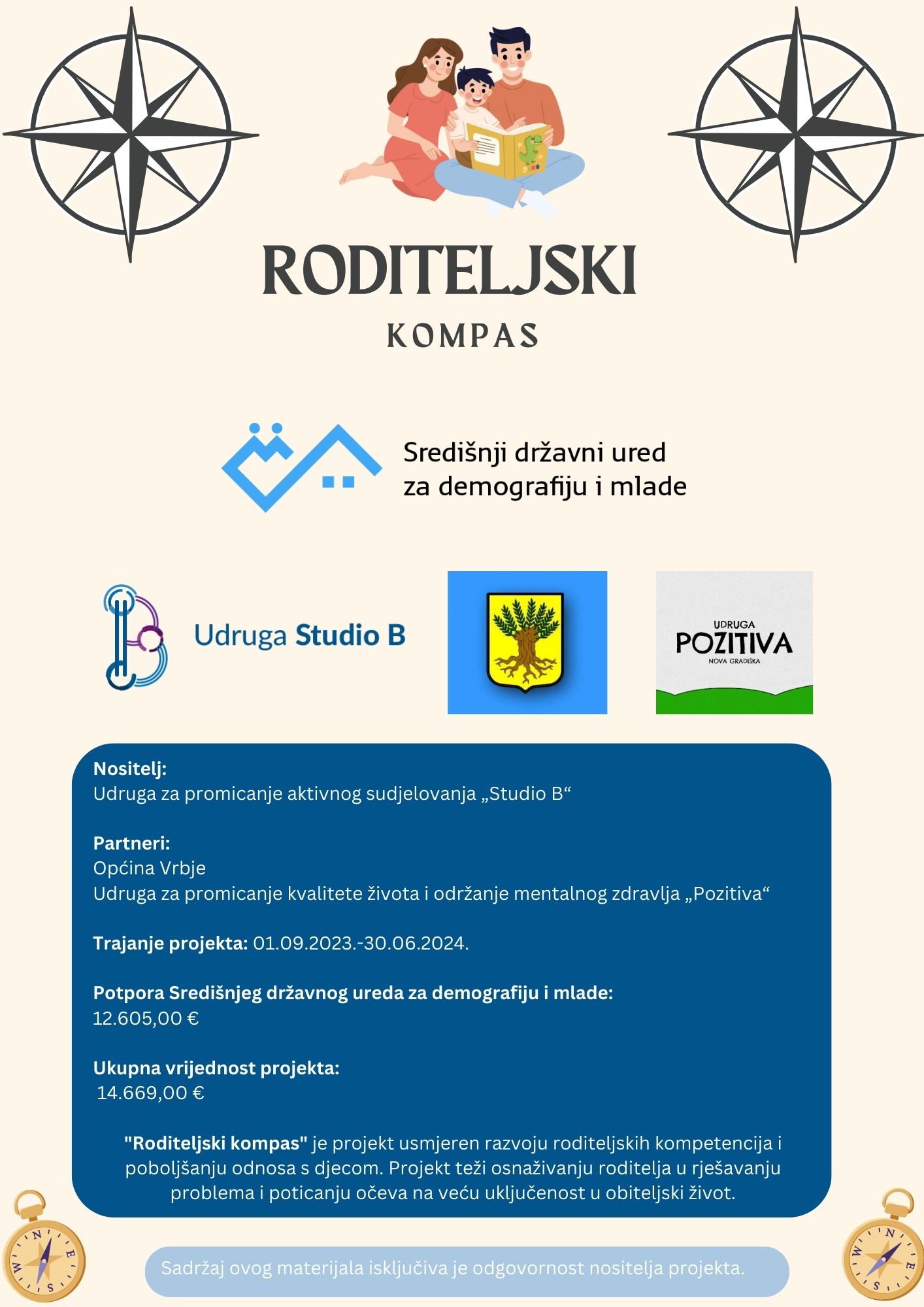 Općina Vrbje je partnerska organizacija na projektu „Roditeljski kompas“ kojega provodi Udruga za promicanje aktivnog sudjelovanja „Studio B“. Projekt je usmjeren razvoju roditeljskih kompetencija i poboljšanju odnosa s djecom koji teži osnaživanju roditelja u rješavanju problema i poticanju očeva na veću uključenost u obiteljski život. Odobren je na Pozivu za prijavu projekta udruga usmjerenih podršci roditeljstvu za 2023. godinu Središnjeg državnog ureda za demografiju i mlade.