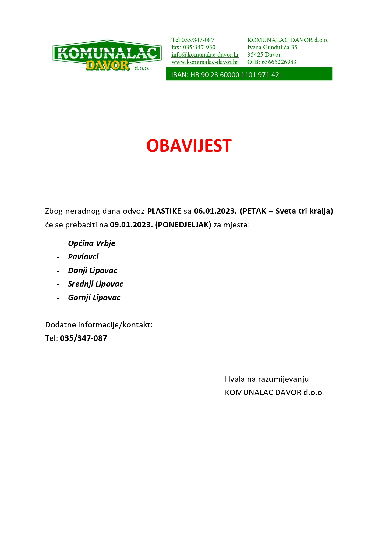 OBAVIJEST O ODVOZU PLASTIKE