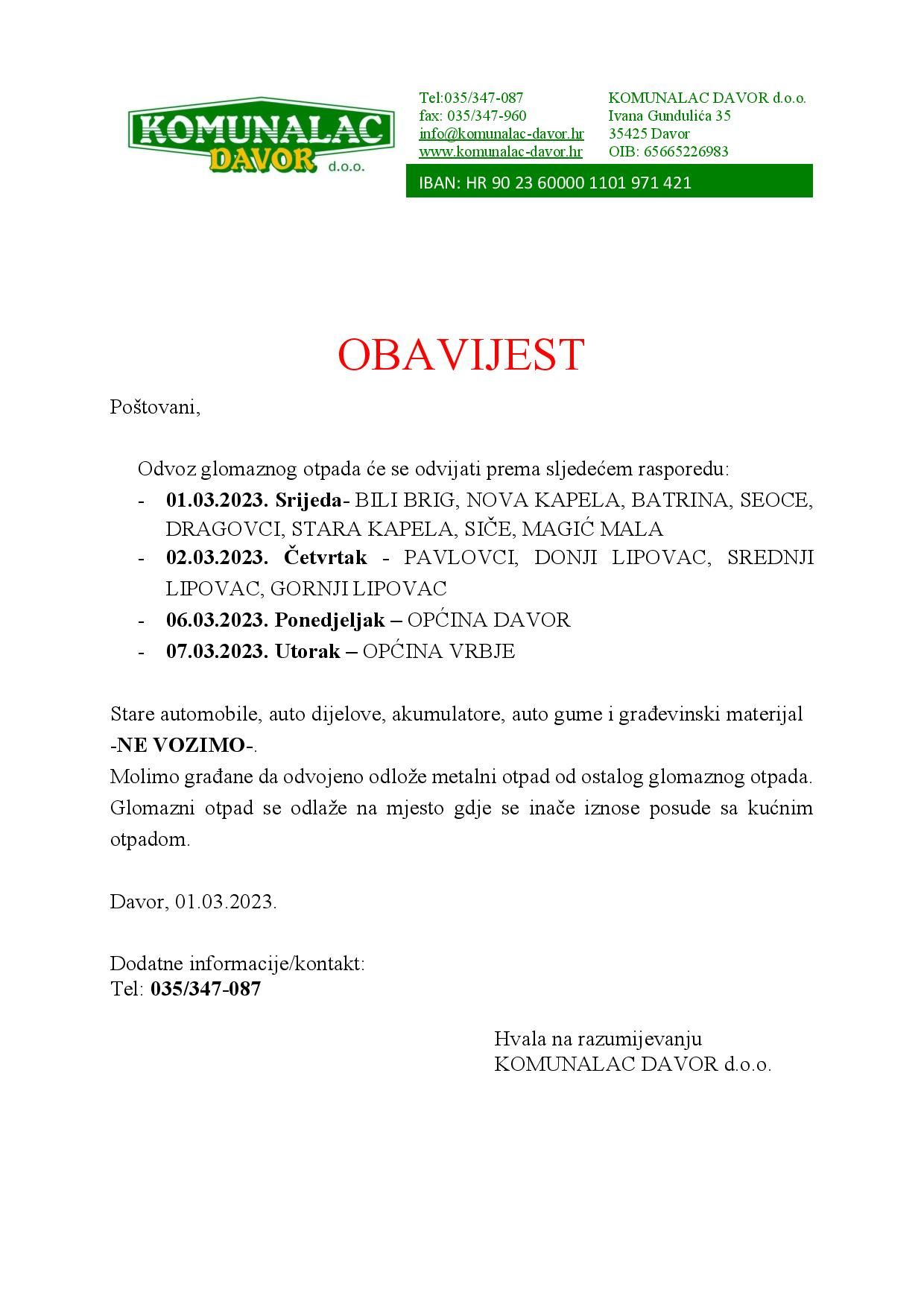 OBAVIJEST O ODVOZU GLOMAZNOG OTPADA NA PODRUČJU OPĆINE VRBJE