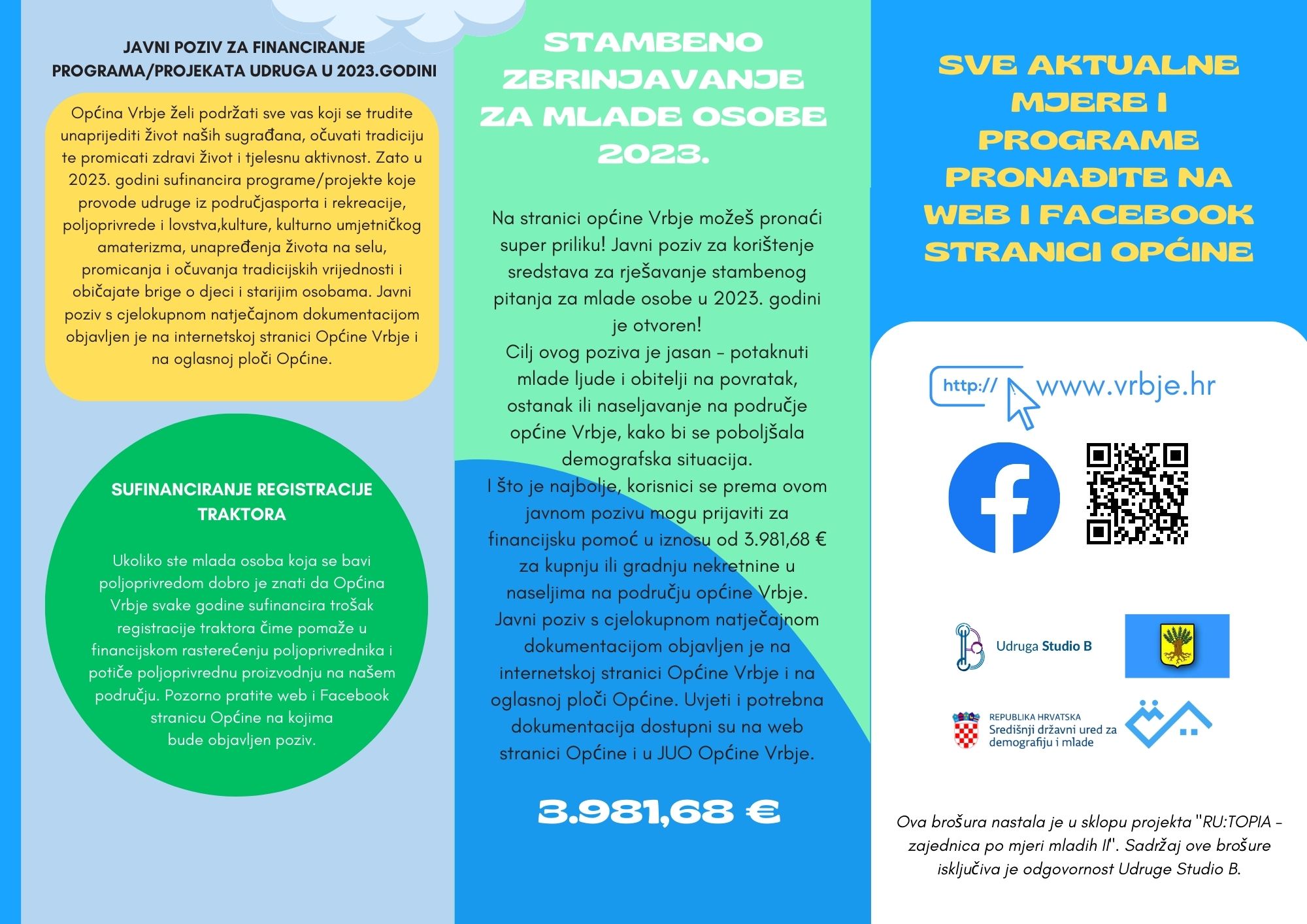 Iz Općine ističu i kako su u proteklih godinu dana proveli projekt „Zajedno za žene II“, financiran kroz Poziv Zaželi – program zapošljavanja žena – faza III. Bio je to nastavak uspješno provedenog projekta u fazi II. Osluškujući potrebe zajednice, te kroz provedbu vrednovanja prvog projekta, zaključili su kako postoji potreba za povećanjem broja zaposlenih žena i krajnjih korisnica i korisnika, stoga su kroz ovaj projekt zaposlili 15 žena te uslugom pomoći u kući koja je trajala 6 mjeseci obuhvatili ukupno 94 krajnja korisnika i korisnice iz gotovo svih naselja općine – Bodovaljaca, Vrbja, Sičica, Doline, Mačkovca i Visoke Grede. Također, bili su partneri Crvenom Križu Nova Gradiška u provedbi projekta financiranog kroz Program Zaželi kojim je zaposleno još 7 žena i obuhvaćeno 42 korisnika. Općina je partner u još nekoliko društvenih projekata koje provode OCD-i s područja općine i šire, od čega naglašavaju provedbu projekta „RU:TOPIA – razvoj zajednice po mjeri mladih“ putem kojeg je izrađen prvi Akcijski plan za mlade Općine Vrbje, odnosno lokalna javna politika usmjerena kreiranju mjera s ciljem poboljšanja kvalitete života mladih, a koji je dobio svoj nastavak i u 2023. godini što pokazuje razinu kvalitete provedbe koju je prepoznao i Središnji državni ured za demografiju i mlade, koji u kontinuitetu od 2019. godine podržava provedbu ovog projekta za mlade u općini Vrbe; te projekt „Budimo zdravi – birajmo zdravlje“ koji je sa svakom aktivnošću obuhvatio veći broj korisnika_ica od onog zadanog projektom, što dokazuje važnost provedbe ovakvih aktivnosti u manjim ruralnim zajednicama kako bi se našem stanovništvu izjednačila dostupnost zdravstvene zaštite i preventivnih zdravstvenih programa. Nadalje, i u ovoj godini provode Program mjera za poticanje rješavanja stambenog pitanja usmjeren mladim obiteljima, podigli su iznos sufinanciranja troškova dječjeg vrtića, isplaćuju jednokratne porodiljne naknade, financiraju i organiziraju program predškolskog obrazovanja, te sufinanciraju nabavu radnih materijala za sve osnovnoškolce s područja općine. Nastavili su s podjelom šarana svim kućanstvima na području općine za Badnjak i Uskrs, te sufinanciranjem registracije traktora poljoprivrednicima i pomažu u nabavi ogrjeva socijalno ugroženim kućanstvima
